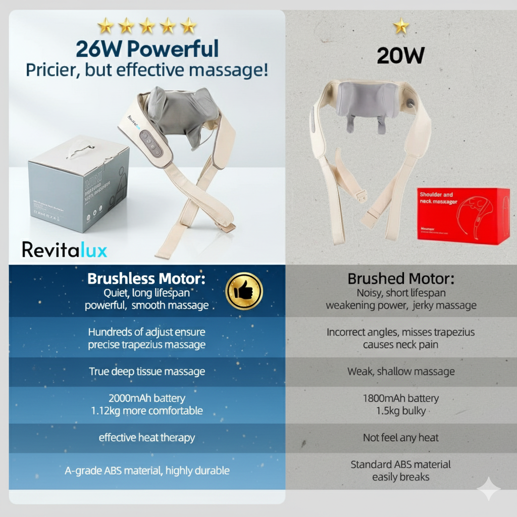is built for power, precision, and long-lasting comfort. Unlike traditional 20W brushed motor massagers that are noisy, weak, and wear out quickly, the 26W design delivers a smooth, deep tissue massage that truly relieves tension. Its advanced brushless motor ensures quiet operation and a longer lifespan, while the built-in heat therapy helps improve circulation and ease stiffness. Lightweight at just 1.12kg, with a strong 2000mAh battery, it’s far more comfortable and reliable than bulky standard models. Crafted with durable A-grade ABS material, the Revitalux massager offers the perfect balance of strength, comfort, and durability—making it a smarter choice for anyone serious about real relief.